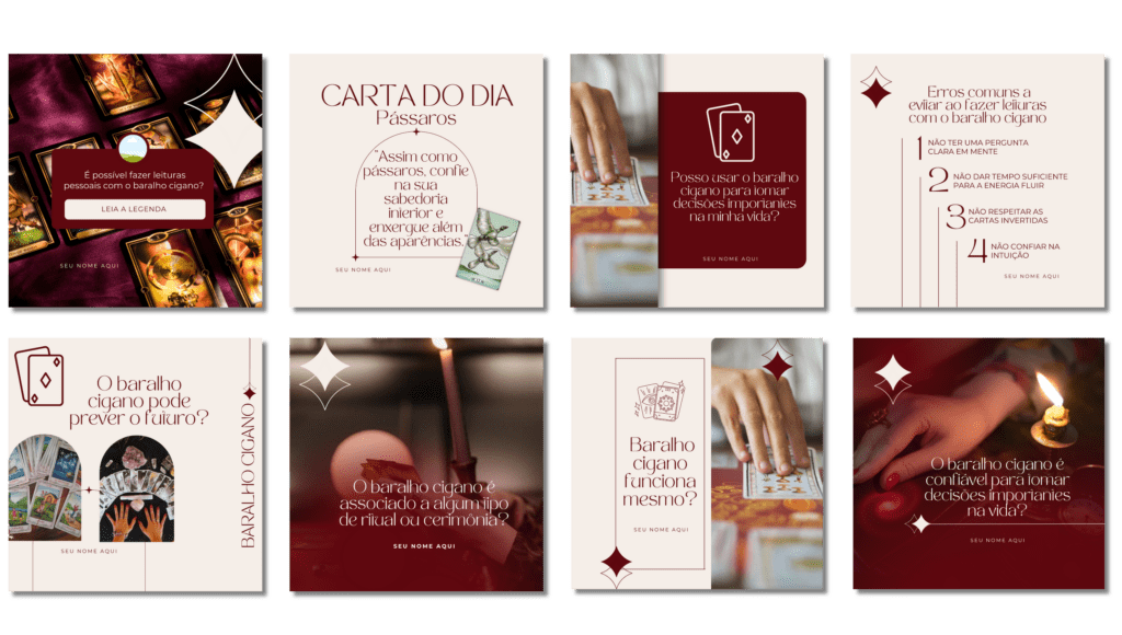 Você terá acesso à artes prontas, com conteúdo e legendas estratégicas para Baralho Cigano e irá conquistar um perfil profissional e atraente para atrair mais clientes todos os dias em poucos cliques!