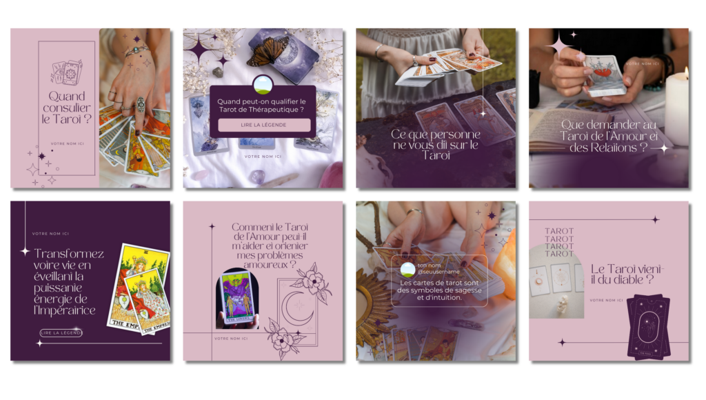 Vous aurez accès à des créations prêtes à l’emploi, avec du contenu et des légendes stratégiques pour Tarot, et vous obtiendrez un profil professionnel et attrayant pour attirer plus de clients chaque jour en quelques clics !